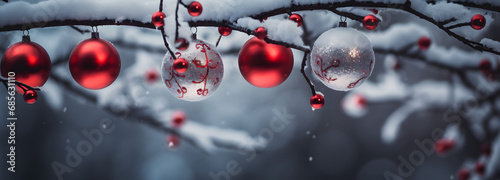 photo of christmas tree branches and christmas ornaments on a snow covered tree, in the style of luminous spheres, dramatic, light red and dark gray, rtx on, outdoor scenes, iconic