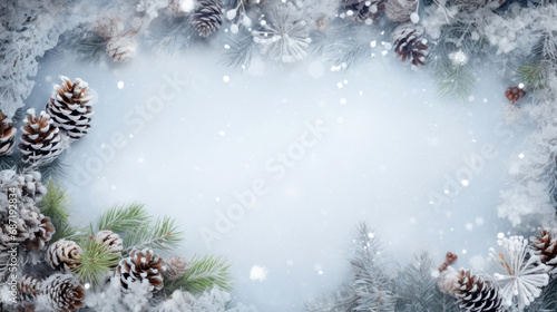 Winter beautiful frame with pinecones and delicate snowflakes