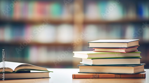 Stack of books and open book on wooden table on blurred background in library room, education and back to school