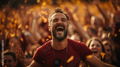 A cheering crowd at an event, celebrating with joy and excitement, creating a vibrant and energetic atmosphere