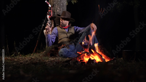 Cowboy near the fire in the forest at night