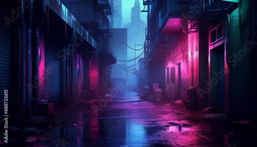 Neon lights of dystopian cyberpunk future. Night time shot of Neon in dense city alley way.