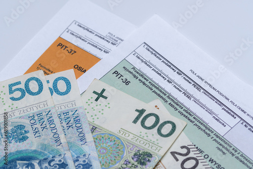 Polskie banknoty leżą na formularzach podatkowych pi37 pit28 cit