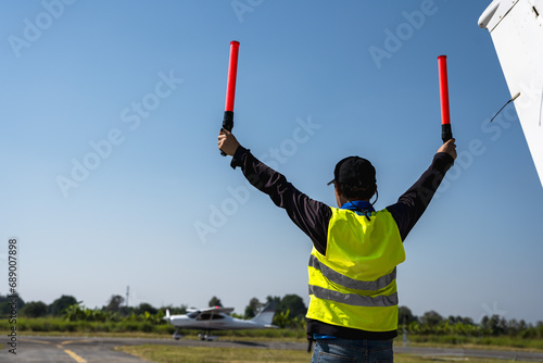 Back view aircraft controller using gesture sticks control small plane in airfield