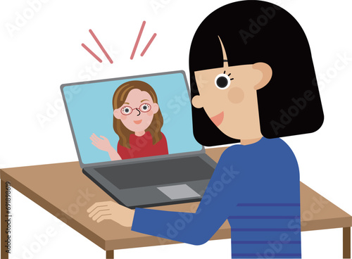 オンラインで英会話をしている黒髪の日本人女性の斜め後ろアングルのイラスト