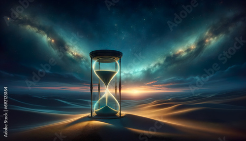 Sands of time. Concept of time passing. Surreal Night Landscape with Ancient Hourglass and Ethereal Nebula. A Mystical Intersection of Time and Cosmic Beauty