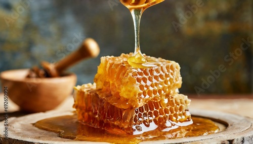 Honey close-up. Amber sweet honey in honeycomb. Transparent honey flows down the honeycomb