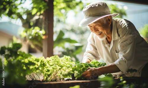 Senior man enjoy with gardening in the backyard. Retirement hobbies and outdoor activity