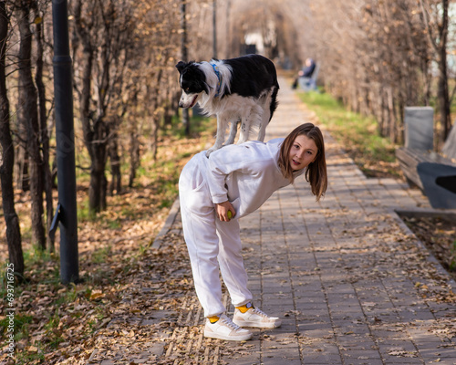 Black and white border collie dog stands on the back of the mistress on a walk in the autumn park.