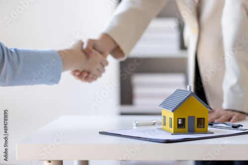 Handshake Real estate brokerage agent Deliver a sample of a model house to the customer, mortgage loan agreement Making lease and buy and sell house And contract home insurance mortgage loan concept