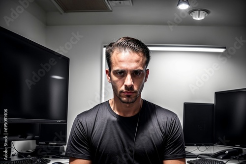 A spy secret agent listening in and wiretapping in using stealth cover operation in a safe room surveilling secretly