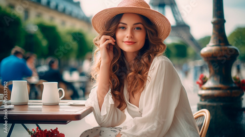 A woman in Paris in a cafe with the Eiffel Tower in the background. Selective focus.