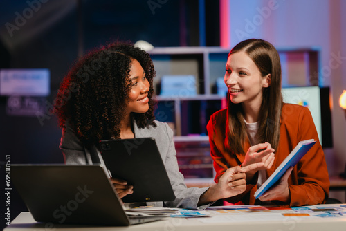 African American business worker with an afro presenting a UX,UI design on a clipboard to a Caucasian colleague in an office setting.