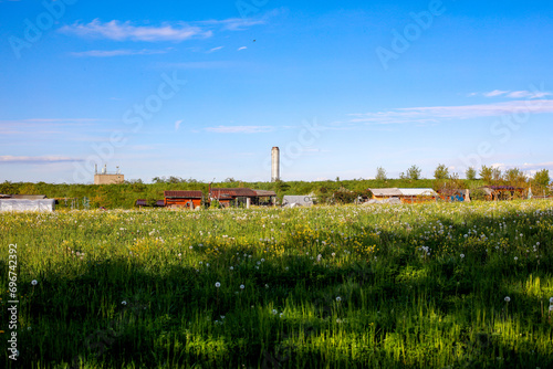Pré avec maisons de jardin et une cheminée de la verrerie en arrière plan à St-Prex