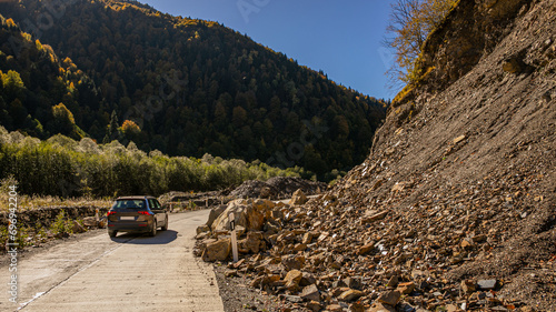 A lone car navigates a mountain road partially obstructed by a rockslide, exemplifying concepts of danger and unpredictability in nature
