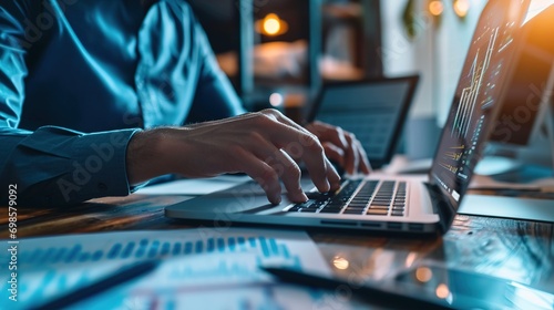 accountant examines a financial statement on a computer using a graph. Auditing the balance sheet