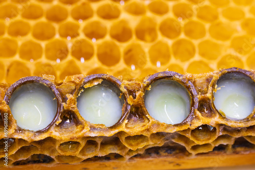 Royal jelly production background photo. queen cells full with royal jelly