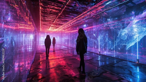 An immersive digital art exhibition with large-scale projections, interactive light displays, and futuristic installations