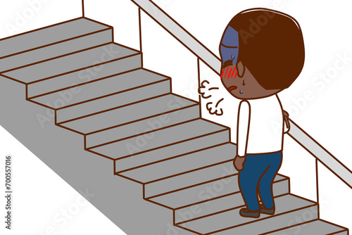(全身斜め後ろ)階段を上っている途中で呼吸ができずとても苦しんでいるアフリカ系男性
