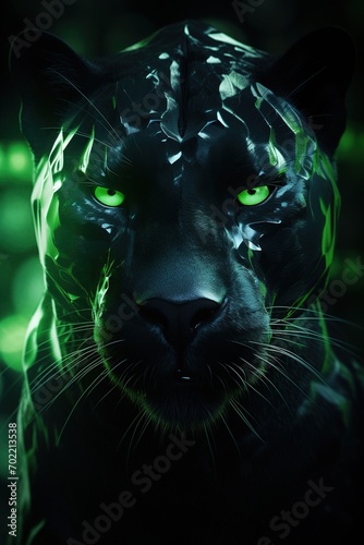 Abstract Panther close-up in green Neon lighting, green eyes, 3D, Banner, Album design, notebooks, smartphone background