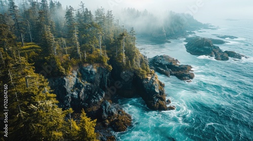 Aerial Photography, rugged coastline of the Pacific Northwest, temperate oceanic climate, rocky shores, dense forests, interplay of land and sea