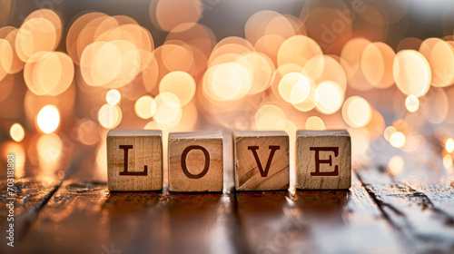 Love message written in wooden blocks in bokeh background. Valentine day.