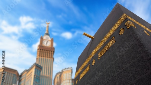 The Holy Kaaba is the center of Islam inside Masjid Al Haram in Mecca. Black silk cloth Kiswah with golden calligraphy in Arabic: "Allah is Great" Islam Iconic Mosque, Al Haram Mecca Saudi Arabia.