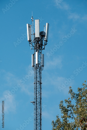 Closeup of a modern communications tower with bright blue sky in the background.