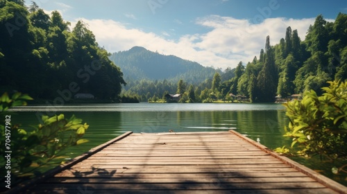 empty wooden jetty / pier , idyllic rainforest lake, copy space, 16:9
