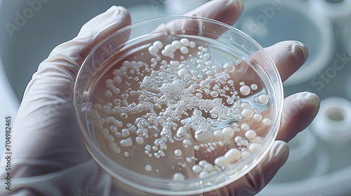 The scientist's hands hold a Petri dish with colonies of fungi. Microbiological Research Laboratory