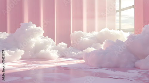 3d interior and exterior pink illustration of comfortable indoor, pink, dreamland, sunlight