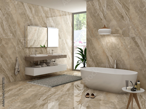 Lavish bathroom interior with light brown marble, wooden unique shelf for toiletries next to white bathtub, and a sophisticated light fixture and a basin and huge mirror over it. 3D Rendering