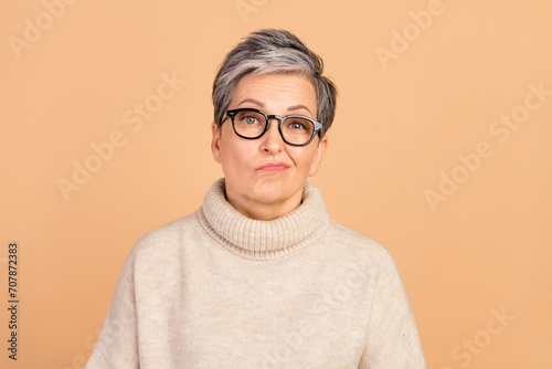 Photo of unsatisfied pensive aged lady sullen face disappointment doubts isolated on beige color background