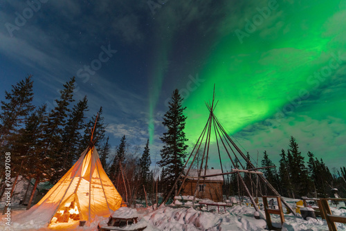 Aurora Borealis, Northern Lights, over aboriginal tent teepee at Yellowknife, Northwest Territories, Canada