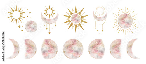 Set of crescent moon, sun, floral elements. Moon, sun and. Isolated watercolor illustration on the topic of astrology and esotericism. Magic celestial clipart for design, print, fabric or background