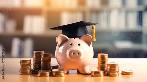 Black Graduation hat on a piggy bank, with gold coins on the background of a university library with copy space. Saving money for education or scholarship. Installment plan for studying