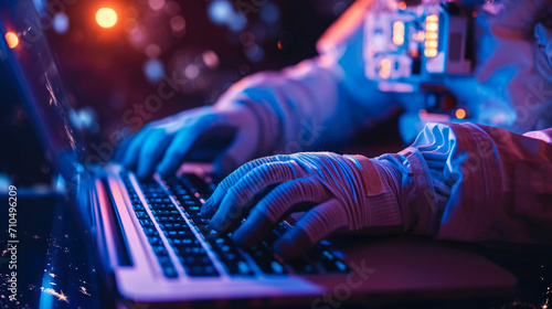 Nebula Notes: Astronaut Focused on Laptop in Celestial Office