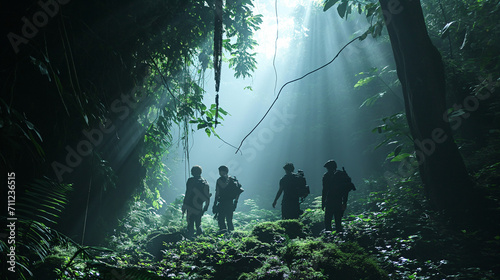 A special forces unit moving through a thick forest, with sunlight piercing through the misty tree canopy