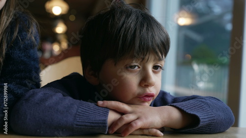 Bored small boy complaining, sulking child feeling annoyed leaning on restaurant table, closeup kid face