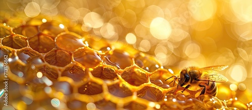 A queen bee cup with royal jelly in the wax comb of the honey bee Apis mellifera. Copy space image. Place for adding text