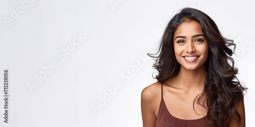 A beautiful young asian indian model woman smiling with clean teeth isolated on white background