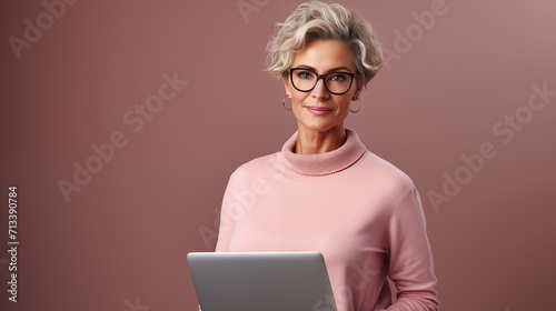 Hermosa y despreocupada mujer de mediana edad que trabajaba con un ordenador portátil. Emoción contenida. Postura estática. Luz suave. Fondo de estudio.
