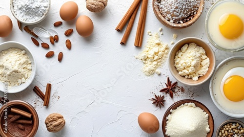 Baking ingredients and utensils for cake decorating on a white surface, showcasing the art of baking