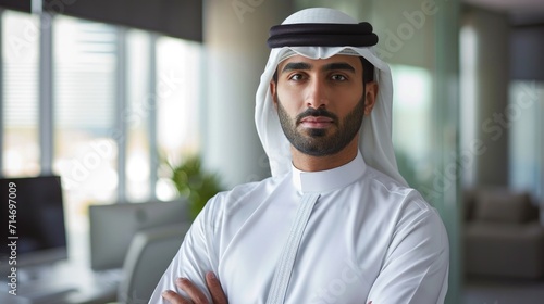 Professional man with dish dasha working in his business office of Dubai. Portraits of a successful businessman in traditional emirates white dress. Concept about middle eastern cultures