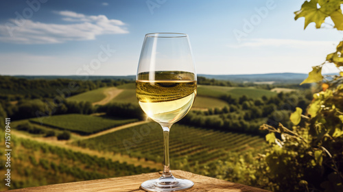 Wine glass with pouring white wine and vineyard landscape on a sunny day