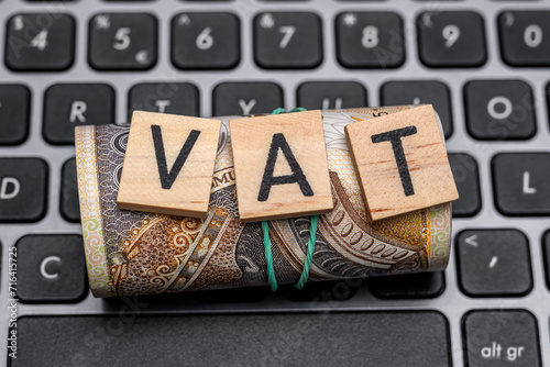 Napis VAT leży na papierowych pieniądzach na komputerze