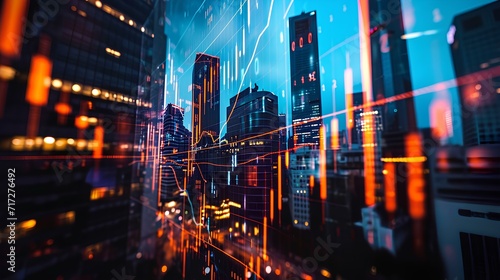 Silhouettes of skyscrapers with superimposed stock market graphs. iconic illustration of financial transaction growth indicators. generative AI