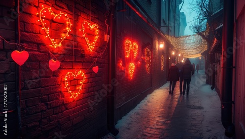 A magical evening Valentine's Day atmosphere as a couple walks hand in hand down a quaint cobblestone street, lanterns and warm streetlights, creating a scene straight out of a romantic fairy tale.