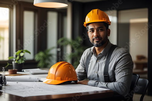 Portrait of professional architect engineer looking at camera with safety helmet, project plan and house model on meeting table while posed with confident