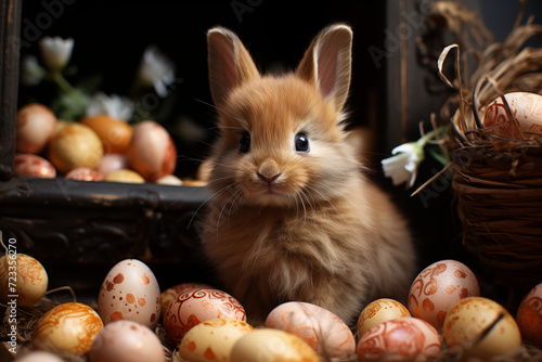 Osterhase mit vielen bunten Eiern, Hase versteckt Ostereier zwischen bunten Blumen, Glückliches Kanninchen